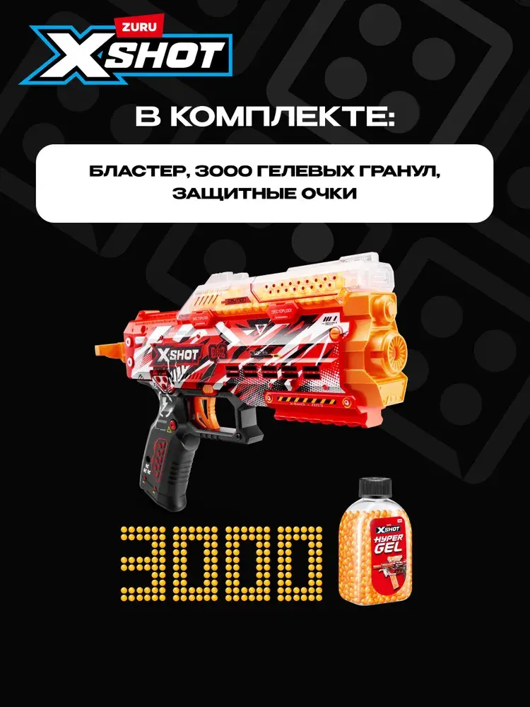 Пришло время развлечься с XSHOT Hyper Gel! XSHOT Hyper Gel Stinger использует механизм ручного запуска для взрыва гранул Hyper Gel со скоростью 45 метров в секунду. Вместимость Stinger — 250 гранул. В комплекте 3000 гранул Hyper Gel и защитные очки. Просто добавьте воды, чтобы начать эпичную битву с Gel Blaster!
