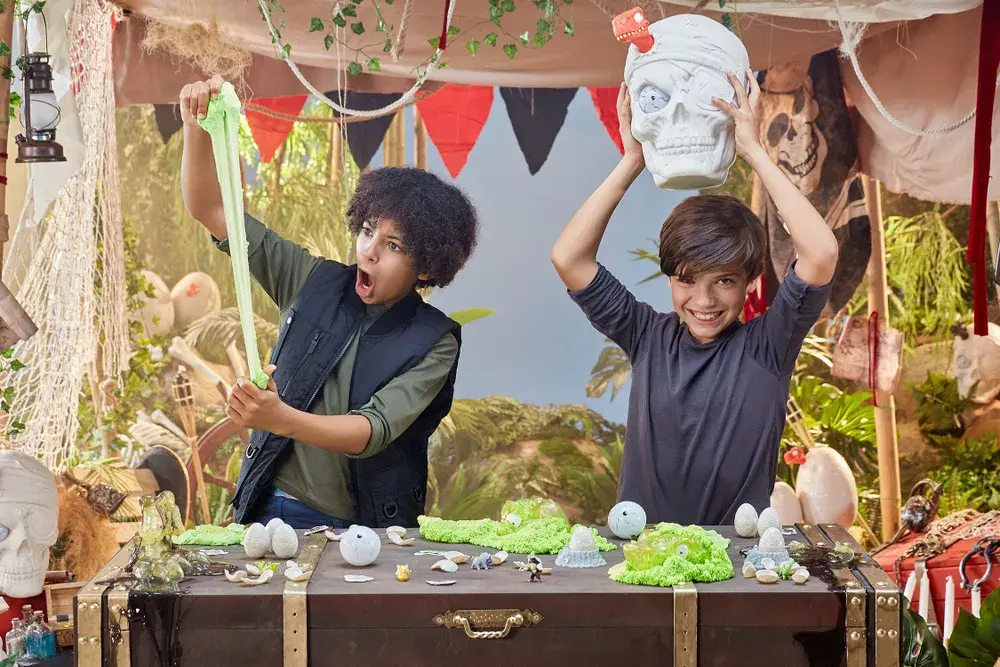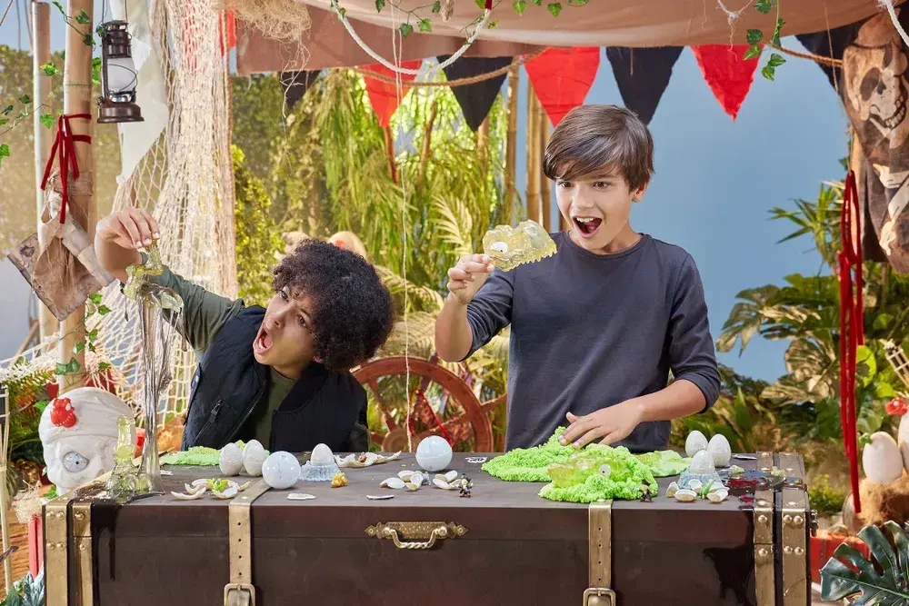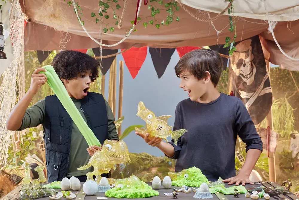 В наборе из серии Dino Island вы найдёте детали от скелета динозавра. Чтобы добраться до них, проберитесь через суперэластичный слайм, динопесок и пенный слайм.
