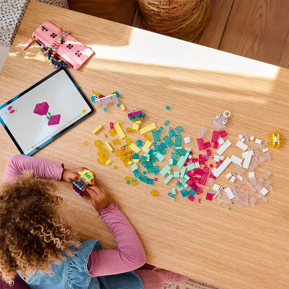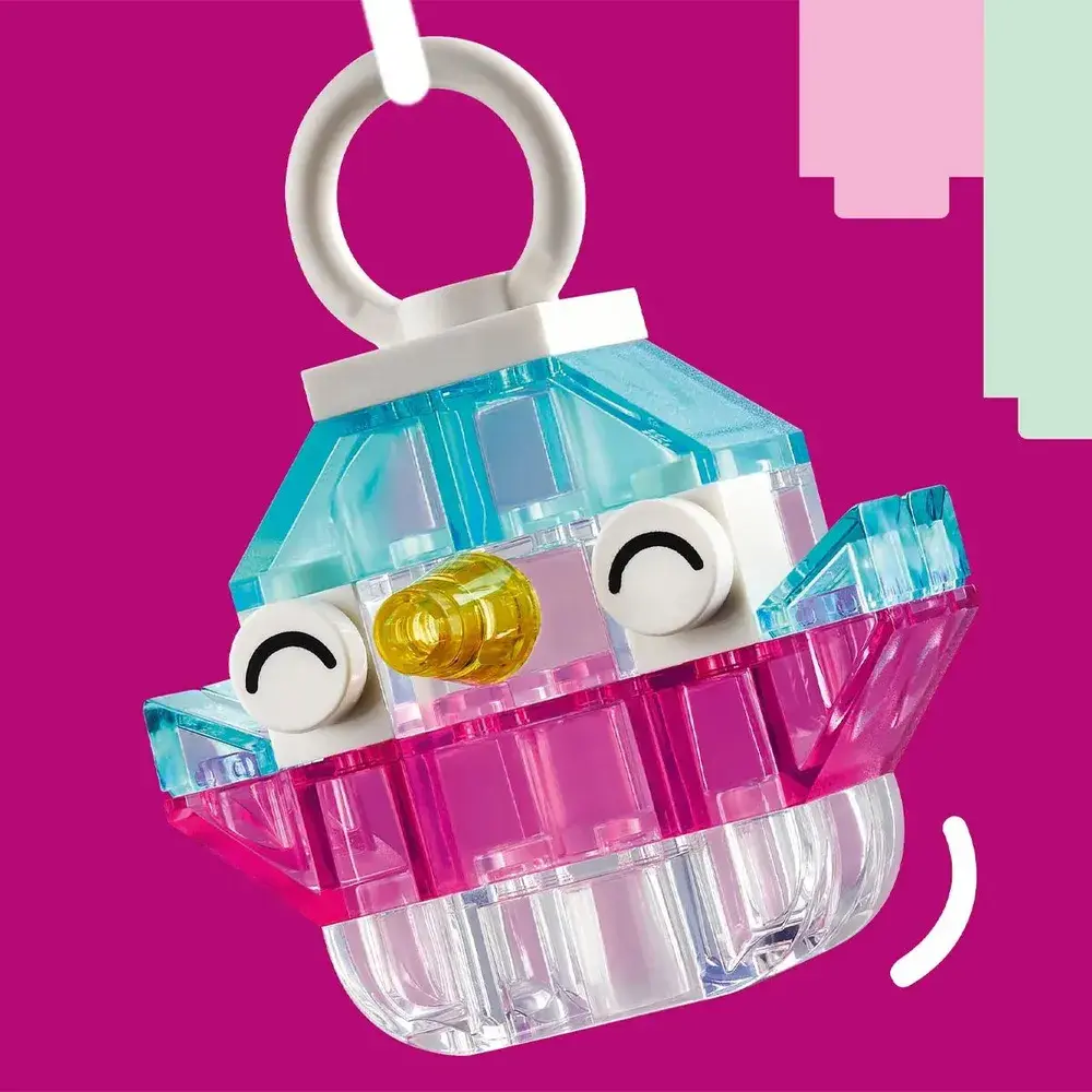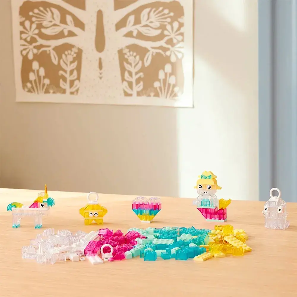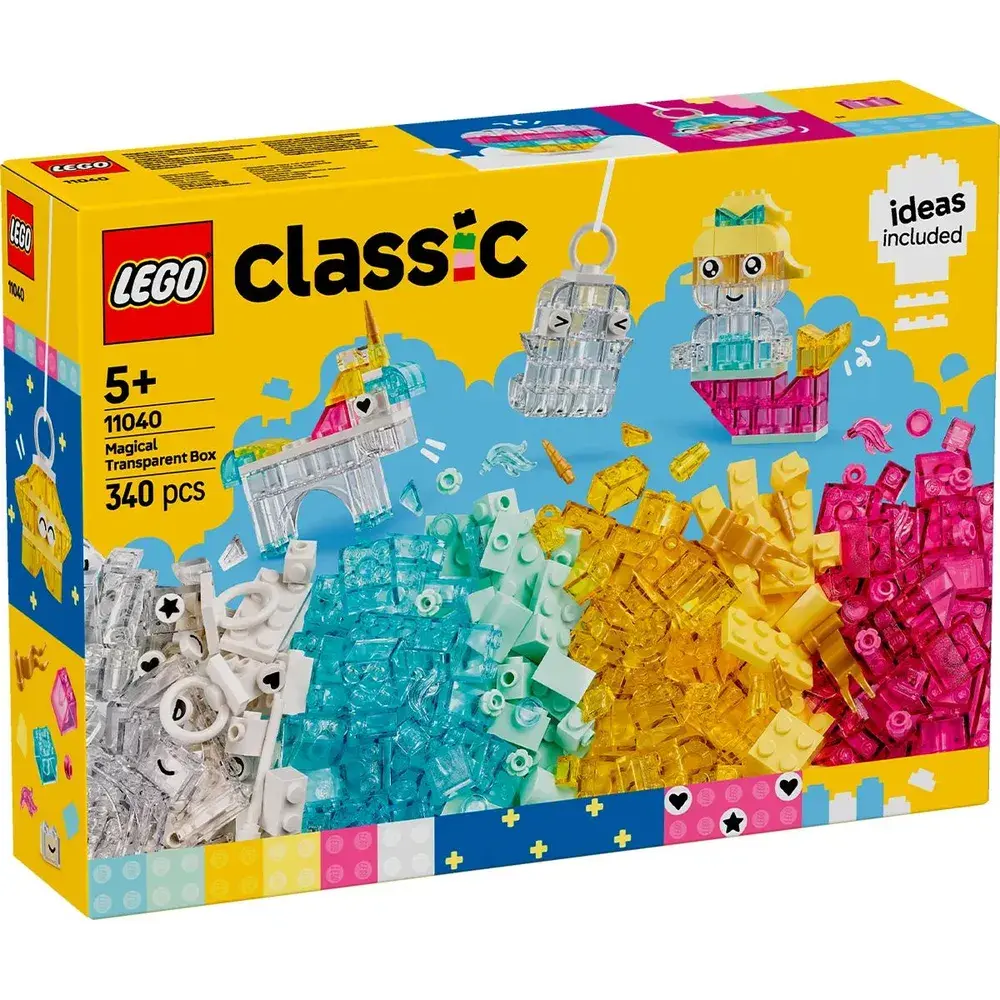 Для транспортировки набор упакован в дополнительную коробку из прочного картона. LEGO Классическая волшебная прозрачная коробка (11040) подарит вам незабываемое творческое удовольствие. Этот набор для сборки и демонстрации, состоящий из 340 разноцветных кубиков, многие из которых прозрачные, а также множества специальных элементов, вдохновляет детей на создание очаровательных моделей и бесконечную игру с воображением. Дети начинают с создания игрушек в виде сердца, призрака, русалки, звезды и единорога. По мере того, как у них растет уверенность в себе, они выбирают космический корабль, облако, падающую звезду, птицу, нарвала, мороженое и цветок. Затем они могут расширить свои творческие возможности, купив большой замок и игрушечного дракона. Полупрозрачные кубики, фигурки для глаз и рта, а также кубики-вешалки для демонстрации придают детским творениям прозрачный блеск и доставляют дополнительное удовольствие от творчества.