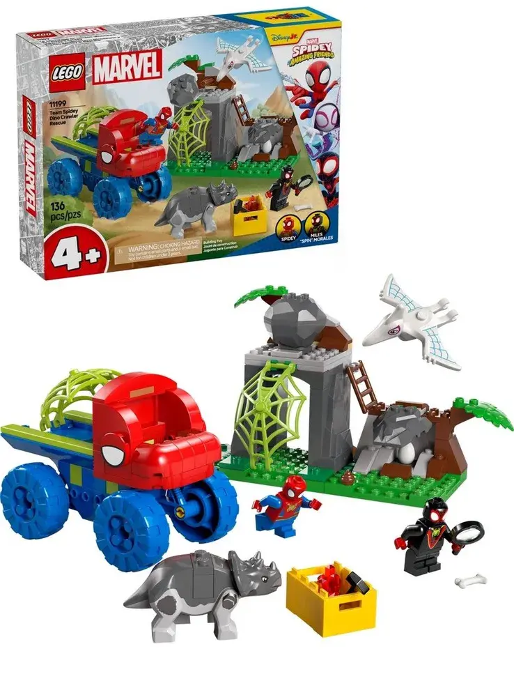 Конструктор LEGO Marvel 11199 «Команда Паучков на спасательной миссии в грузовике-динозавре» — это игровой набор для детей от 4 лет, сочетающий элементы строительства и ролевых игр. Он включает 136 деталей, минифигурки супергероев и динозавров, а также функциональные элементы для увлекательных приключений.