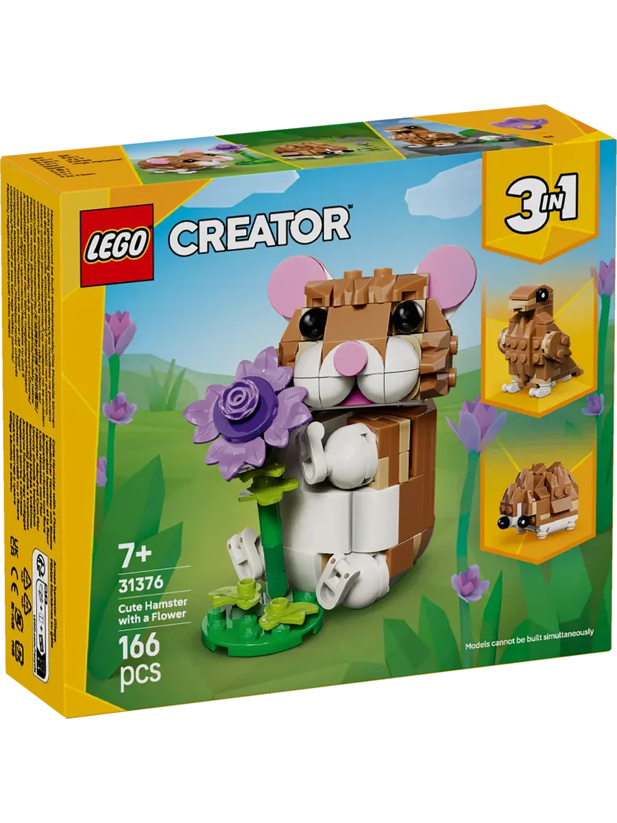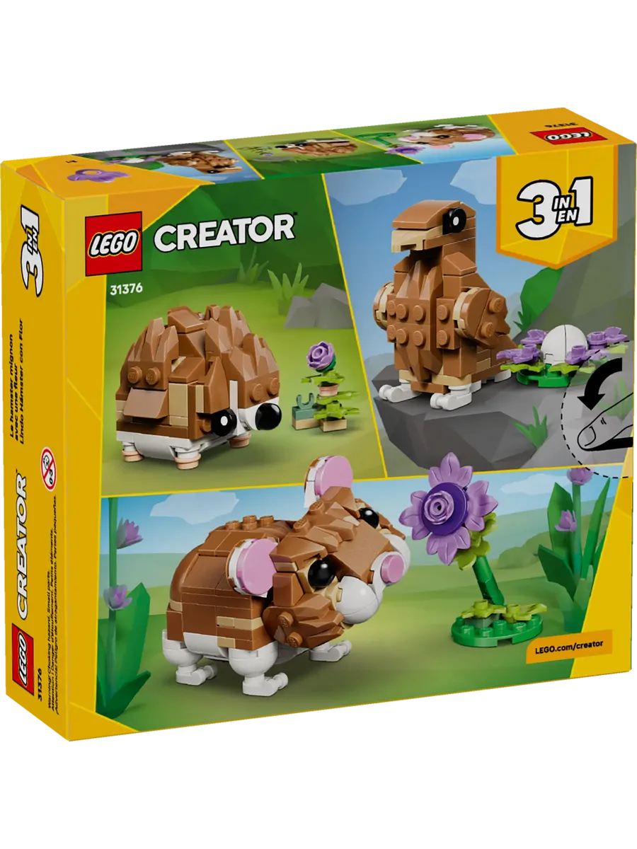 Девочки и мальчики от 7 лет, любящие животных, могут разыгрывать забавные истории с этим конструктором LEGO Creator 3 в 1 «Милый хомяк с цветком» (31376). Этот очаровательный игровой набор с животными предлагает 3 различных варианта сборки из одного и того же набора кубиков. Дети могут выбрать сборку игрушечного хомяка с подвижной головой и передними лапами и фиолетовым цветком. Они также могут перестроить его в игрушечного ёжика с цветком или подвижного орла с яйцом в гнезде. После того, как сборка и игра закончатся, каждую модель можно выставить в качестве милого украшения комнаты на полке или столе. Этот набор LEGO Creator 3 в 1 вдохновит детей на воображение и станет отличным милым подарком для девочек и мальчиков, которые любят животных и любят ролевые игры. А с приложением LEGO Builder дети также могут испытать легкое и интуитивно понятное приключение по сборке. Они могут увеличивать и вращать свои наборы с помощью 3D-инструкций по сборке, отслеживать свой прогресс и сохранять их в одном месте. Обратите внимание, что модели нельзя собирать одновременно.