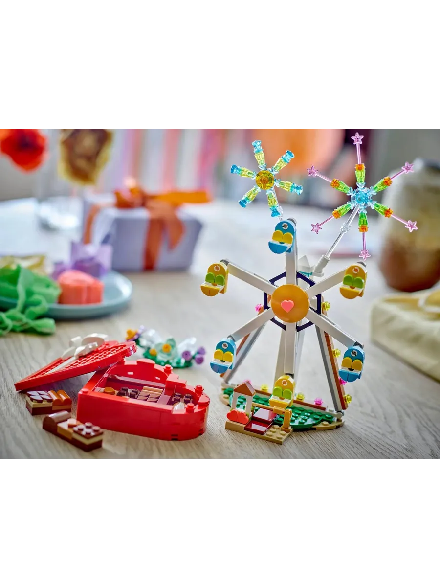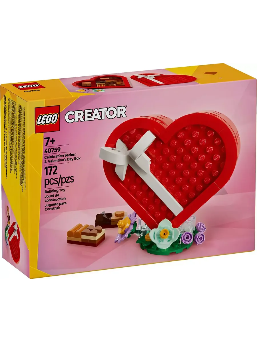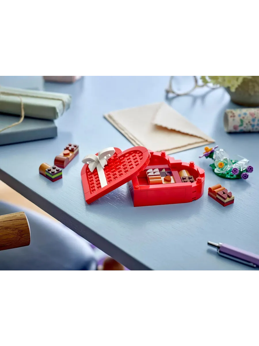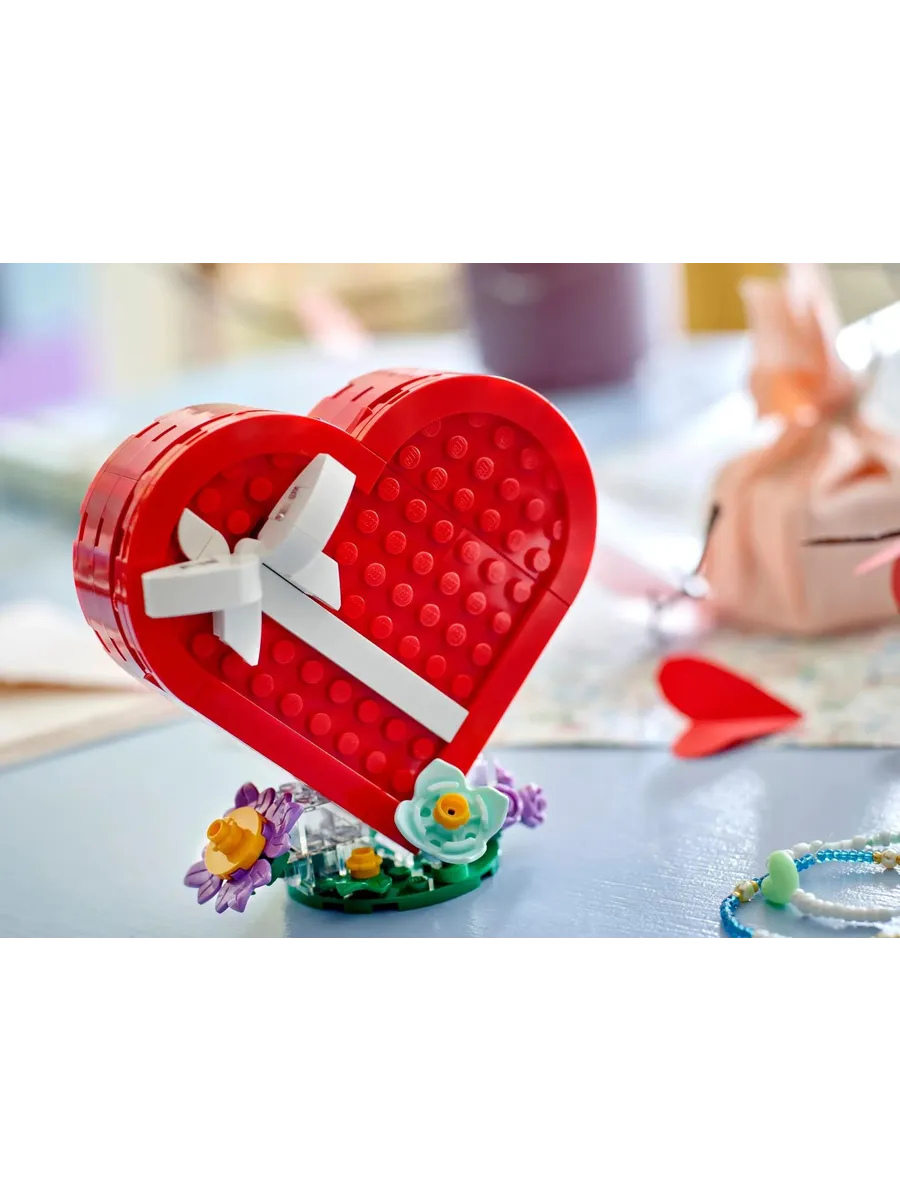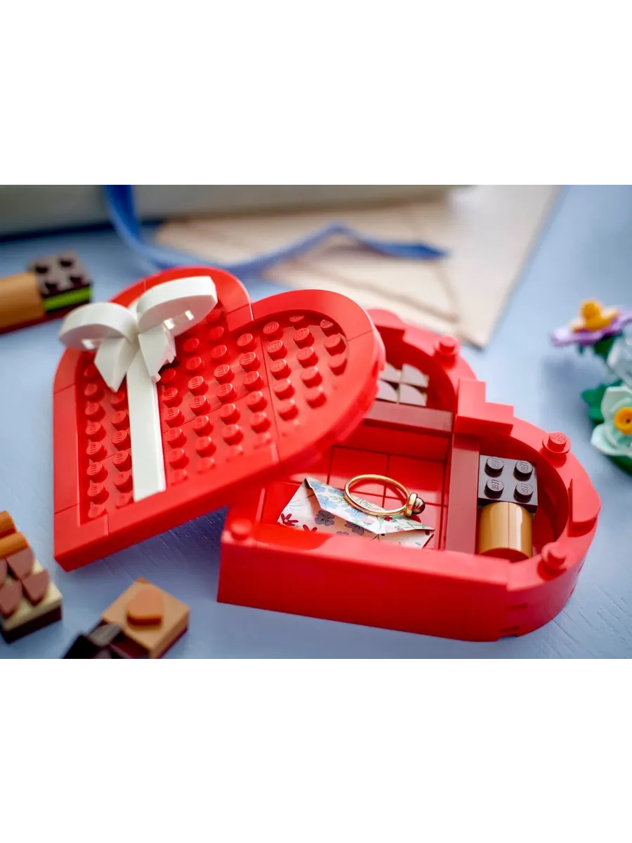 Конструктор Creator 40759 Коробка ко Дню святого Валентина. Красная коробка в форме сердца с белым бантом стоит на стенде, украшенном цветами. Поднимите крышку коробки, чтобы увидеть 2 элемента-сердечка и коллекцию кубиков в шоколадном стиле разных цветов, размеров и текстур. Шкатулку можно использовать для хранения других вещей, и она станет отличным подарком любимому человеку или детям от 7 лет и старше. Серия: Creator Возраст: 7+ 172 детали