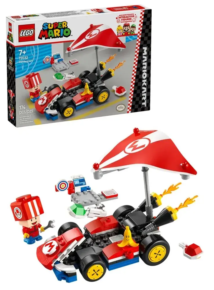 72032 Конструктор LEGO Super Mario Kart Standard Kart Стандартный карт 174 детали Приготовьтесь к гонкам, дрифту и скольжению на стандартном картинге с этим набором для детей (72032). Захватывающая идея подарка на день рождения LEGO Super Mario для мальчиков, девочек и геймеров в возрасте от 7 лет и старше. В набор входит сборная модель стандартного картинга из Mario Kart, рабочая станция с мишенью и фигурка Тоада (команда пит-стопа) в красной форме команды пит-стопа. Стандартный картинг оснащен съемным суперпланером, колесами, которые позволяют дрифтовать, и функцией запуска для стрельбы снарядами по цели рабочей станции. Управляйте картом с фигуркой LEGO Mario, LEGO Luigi или LEGO Peach (из наборов 71439, 71440 или 71441 — продаются отдельно) для интерактивной игры, включая звуковые эффекты для начала гонки, гудка, дрифта и скольжения, а также нажимайте на кнопку Action Tag на рабочей станции для получения дополнительных цифровых реакций. Этот коллекционный набор Nintendo отлично подходит для самостоятельной игры или для общения. Обратите внимание на другие транспортные средства (продаются отдельно), с которыми можно посоревноваться в серии LEGO Super Mario: Mario Kart. Игровой набор с машинками LEGO Super Mario— присоединяйтесь к Тоаду (Pit Crew) для участия в гонках, дрифте и скольжении с помощью сборной модели стандартного карта из Mario Kart, а также рабочей станции. Фигурка Тоада (команда питчеров) – этот игровой набор LEGO Mario Kartadventure включает в себя фигурку Тоада (команда питчеров) в красной форме команды питчеров, а также элемент Банан с украшением для лица. Набор Mario Kart – Стандартный карт оснащен съемным суперпланом, колесами, которые позволяют дрифтовать, и функцией запуска для стрельбы снарядами по цели рабочей станции. Интерактивная игра – поместите LEGO Mario, LEGO Luigi или LEGO Peach (фигурки не входят в комплект) в карт для звуковых/визуальных эффектов и нажмите на кнопку Action Tag на рабочей станции для других цифровых реакций.